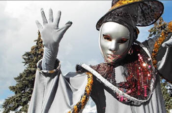 акробатами и танцорами, использует ходули, исполняет