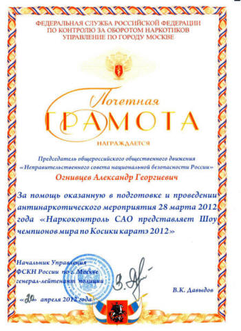 награжден Почетной грамотой УФСКН России по городу Москве по
