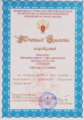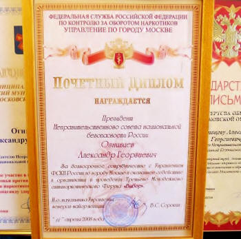 А.Г.Огнивцев был награжден Почетным дипломом УФСКН России по городу Москве
