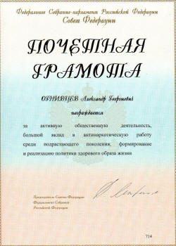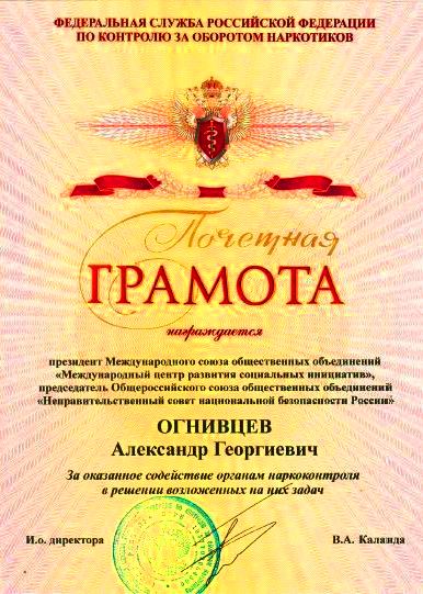 А.Г.Огнивцев был награжден Почетной грамотой Управления ФСКН