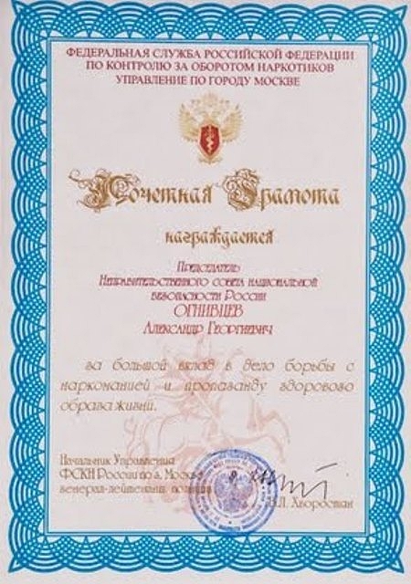 Почетная грамота Управления ФСКН России по Москве за подписью