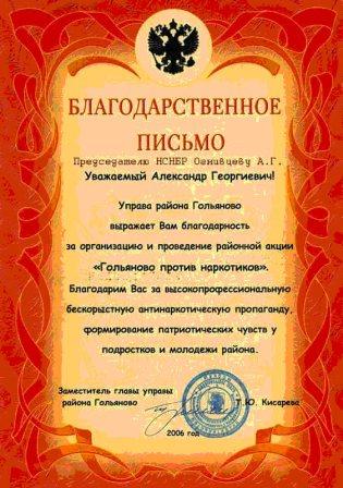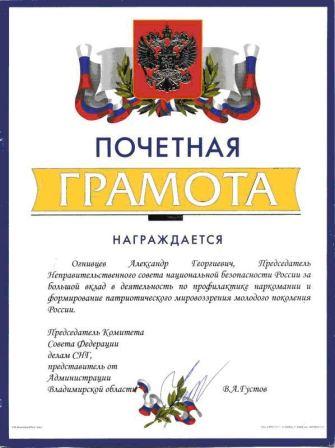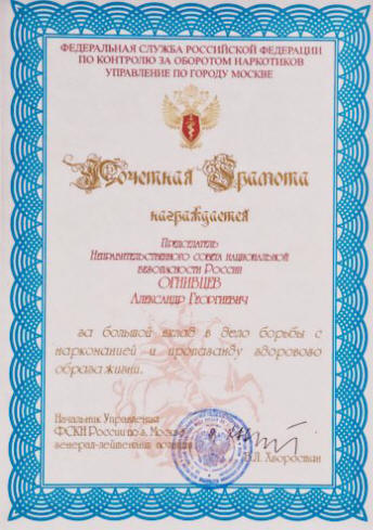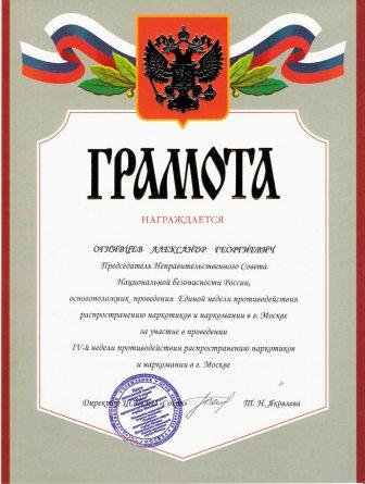 Председатель НСНБР А.Г.Огнивцев награжден Почетной грамотой УФСКН России