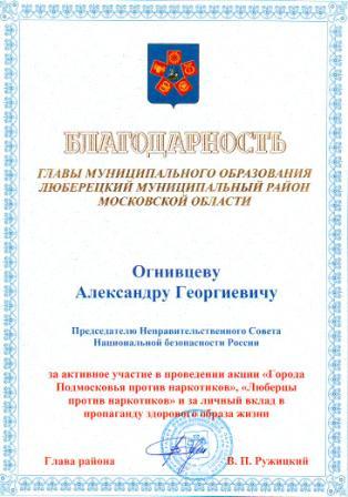Благодарность Главы Люберецкого района Московской области