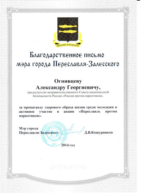 грамоты ФСКН России и Благодарственное письмо мэра города